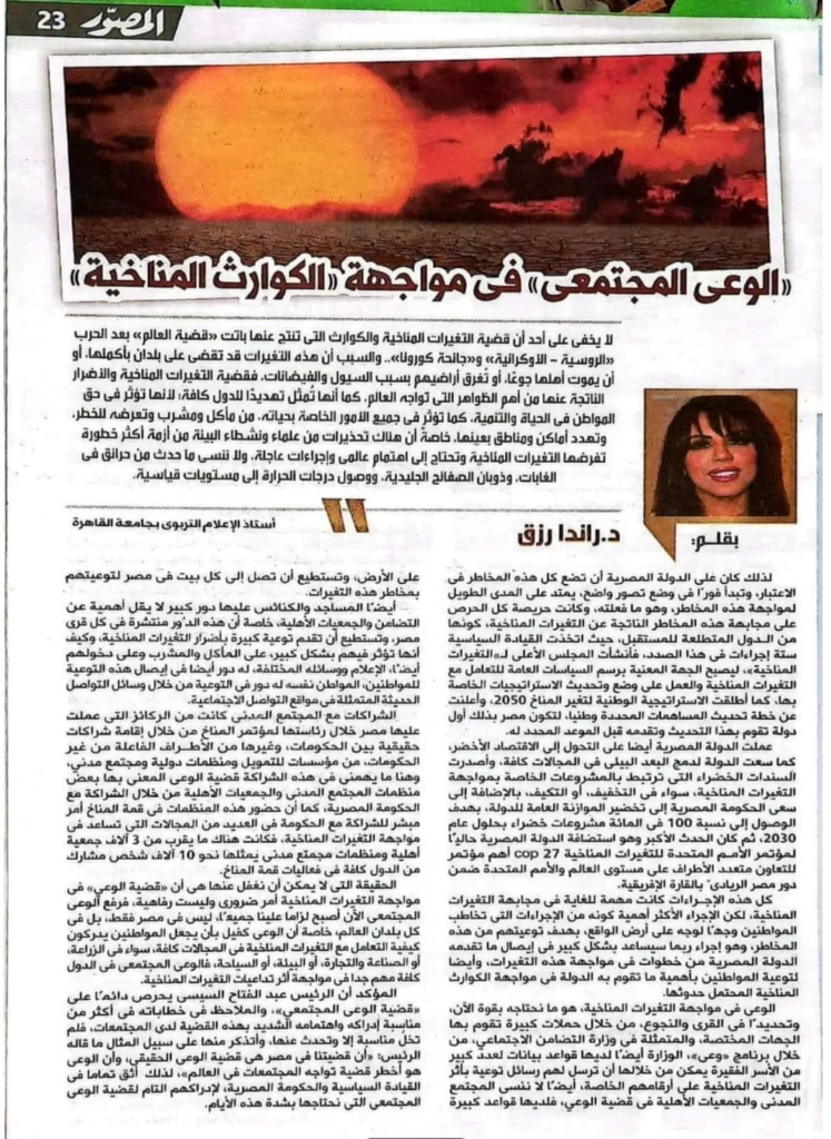 لا يخفى على أحد أن قضية التغيرات المناخية والكوارث التي تنتج عنها باتت قضية العالم بعد الحرب الروسية – الأوكرانية، وجائحة كورونا، والسبب أن هذه التغيرات قد تقضي على بلدان بأكملها، أو تؤدي إلى خسائر فادحة في الأرواح والممتلكات. فقضية التغيرات المناخية ليست قضية الدول المتقدمة وحدها، وإنما هي همٌّ عالمي يواجه العالم كله، كما أنها تمثل تهديدًا للدول كافة، لاسيما الدول النامية، وهو ما يفرض ضرورة تضافر الجهود الرسمية والمجتمعية، خاصة في ظل ما نشهده من موجات حرارة غير مسبوقة، وحرائق الغابات، وذوبان الكتل الجليدية، وارتفاع منسوب البحار، وما يترتب على ذلك من مخاطر تهدد الأمن الغذائي والمائي والصحي. وتُعد قضية الوعي المجتمعي من أهم الأدوات التي يمكن من خلالها مواجهة هذه الكوارث، حيث يسهم رفع وعي المواطنين بطبيعة المخاطر المناخية وسبل التعامل معها في الحد من آثارها السلبية. فالمجتمع الواعي هو القادر على التفاعل الإيجابي مع السياسات البيئية، ودعم جهود الدولة في مجالات التكيف والتخفيف من آثار التغيرات المناخية. وقد أولت الدولة المصرية اهتمامًا كبيرًا بقضية التغيرات المناخية، انطلاقًا من إدراكها لأهمية البعد البيئي في تحقيق التنمية المستدامة، حيث أطلقت الاستراتيجية الوطنية لتغير المناخ 2050، التي تهدف إلى تحسين القدرة على التكيف مع التغيرات المناخية، وتقليل الانبعاثات، وتحقيق نمو اقتصادي مستدام منخفض الانبعاثات. كما لعبت المؤسسات الإعلامية دورًا مهمًا في نشر الوعي البيئي، من خلال تسليط الضوء على مخاطر التغيرات المناخية، وتقديم الرسائل التوعوية التي تستهدف مختلف فئات المجتمع، وهو ما يتطلب تكثيف الحملات الإعلامية، وتوظيف وسائل الإعلام التقليدية والرقمية، ومنصات التواصل الاجتماعي، لنشر ثقافة الحفاظ على البيئة، وتعزيز السلوكيات الإيجابية لدى المواطنين. ويظل الوعي المجتمعي حجر الزاوية في مواجهة الكوارث المناخية، فلا يمكن لأي خطط أو استراتيجيات أن تنجح دون مشاركة مجتمعية فعالة، وإدراك حقيقي بخطورة المرحلة، وأهمية التكاتف بين الدولة والمجتمع، من أجل حماية الإنسان والبيئة، وضمان حق الأجيال القادمة في بيئة آمنة ومستدامة. د. راندا رزق أستاذ الإعلام التربوي – جامعة القاهرة