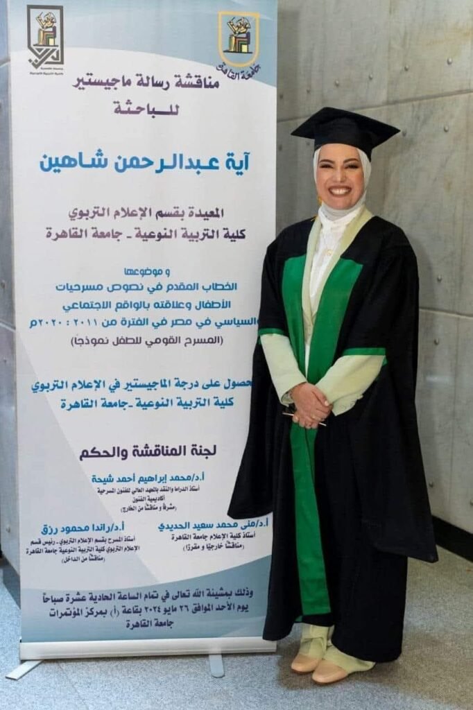 في أجواء علمية متميزة يسودها الحوار الأكاديمي الجاد، شهد قسم الإعلام التربوي بكلية التربية النوعية – جامعة القاهرة، مناقشة رسالة الماجستير المقدمة من الباحثة/ آية عبد الرحمن شاهين، والتي تناولت الخطاب المقدم في نصوص مسرحيات الأطفال وعلاقته بالواقع الاجتماعي والسياسي في مصر خلال الفترة من 2011 إلى 2020.